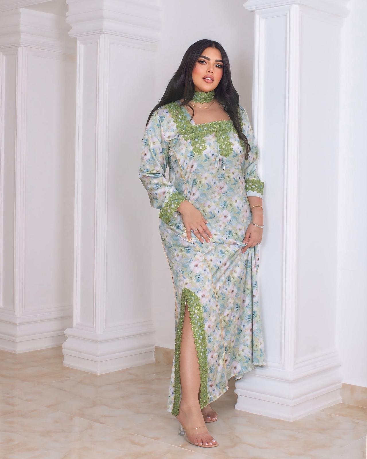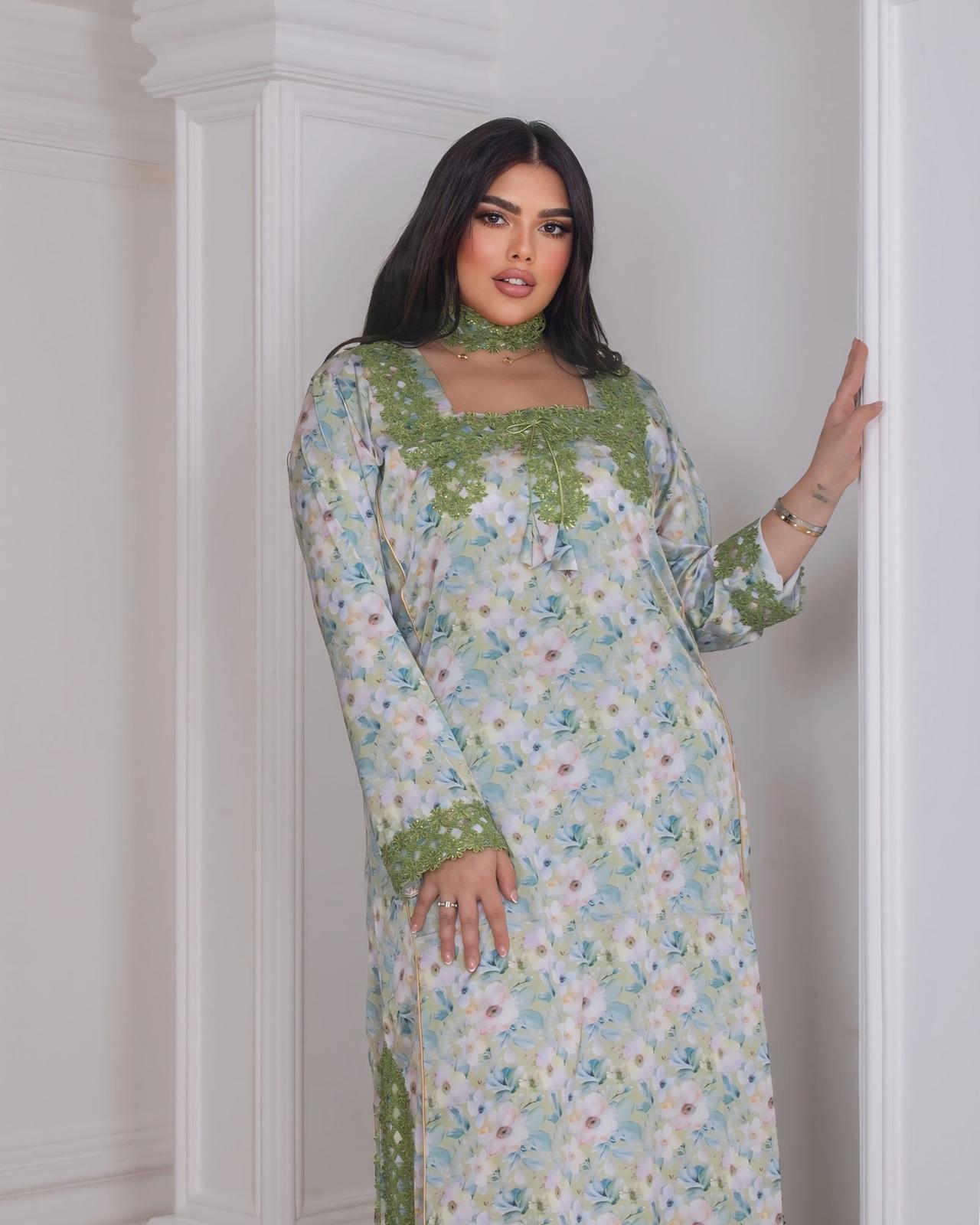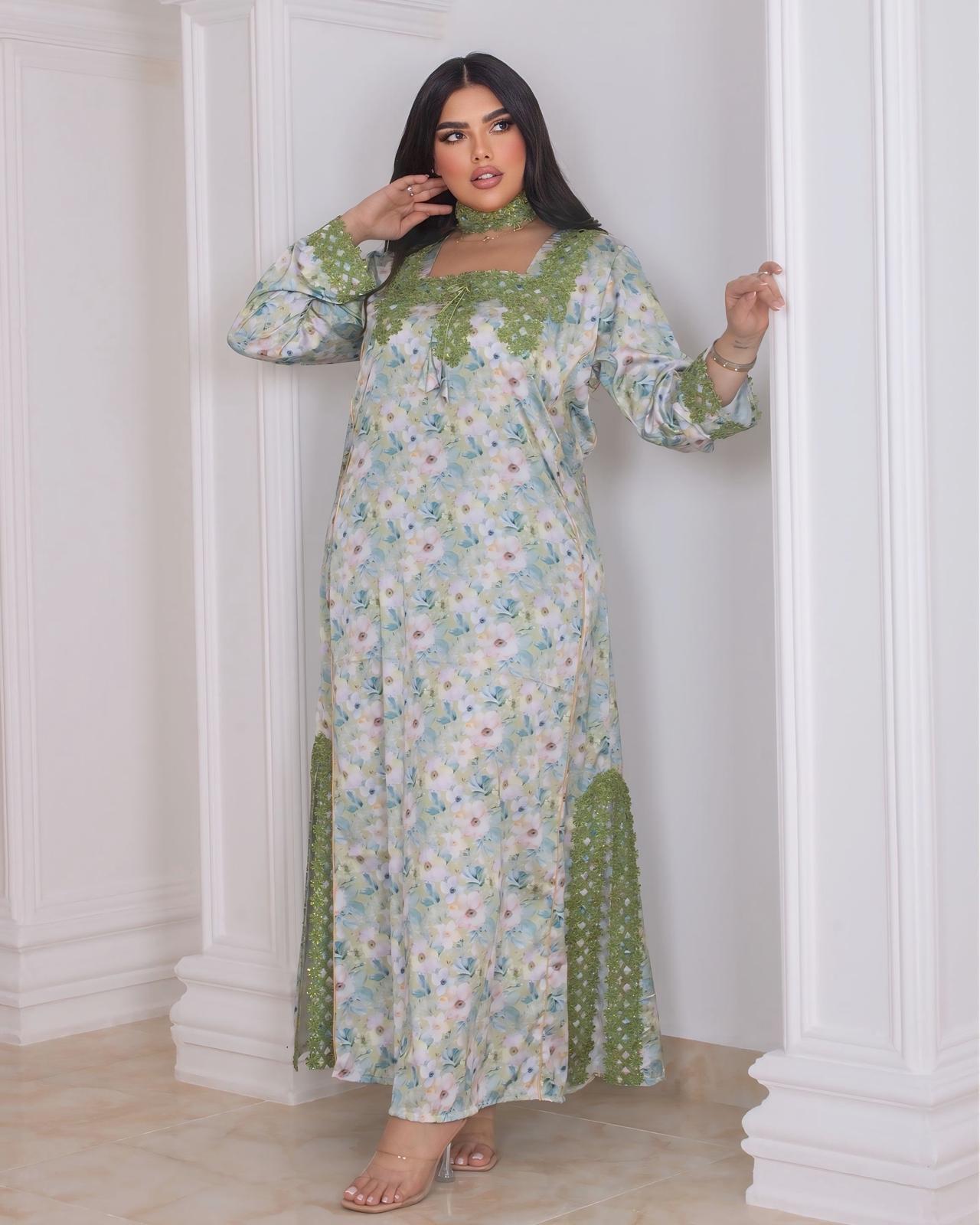 • Accents: Green lace embroidery on neckline, cuffs & choker