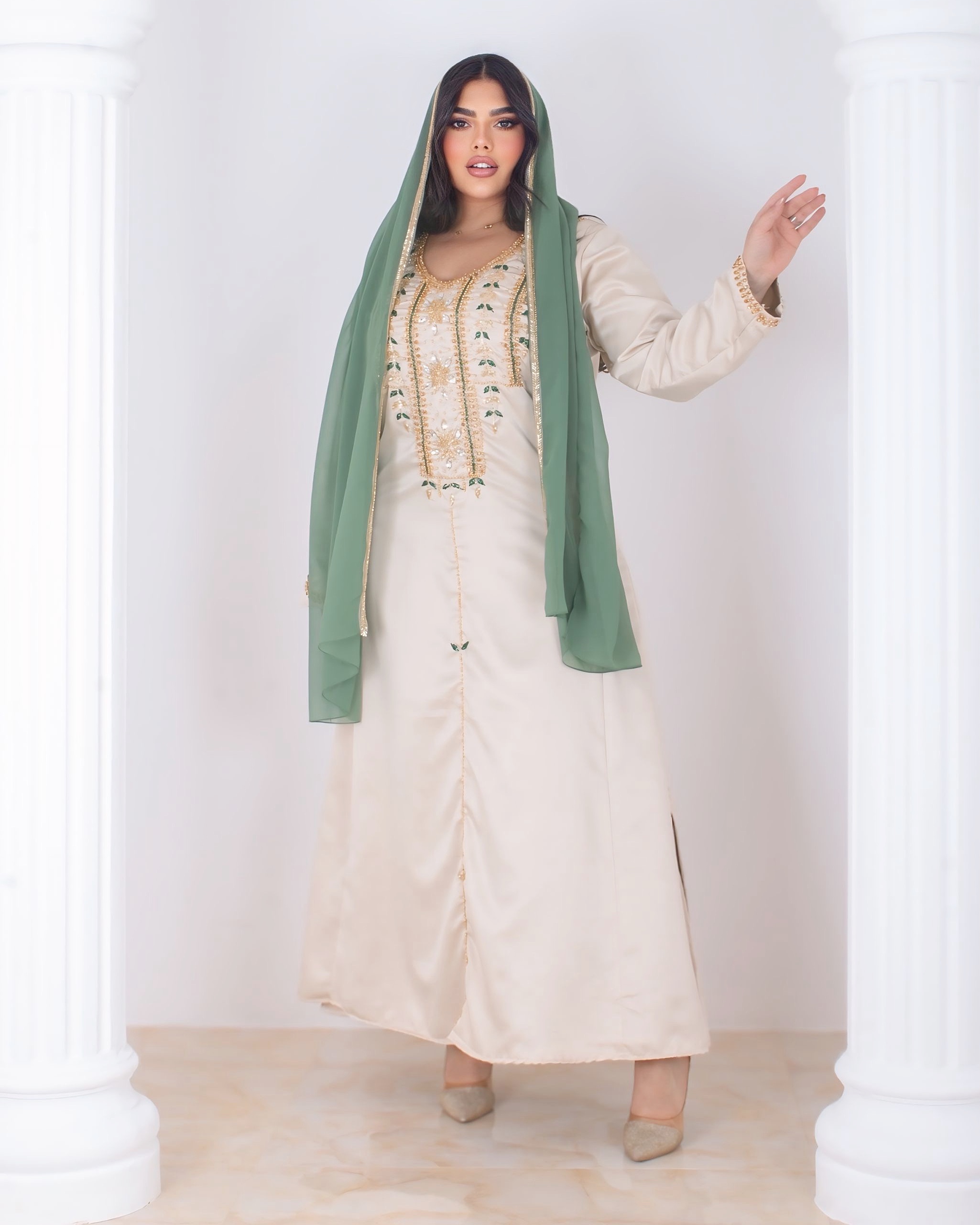 Elevate your elegant wardrobe with this luxurious traditional ensemble, designed with refined details and timeless modesty. The full-length cream dress features intricate gold and green embroidery along the neckline, front panel, and sleeve cuffs, adding a touch of sophistication.