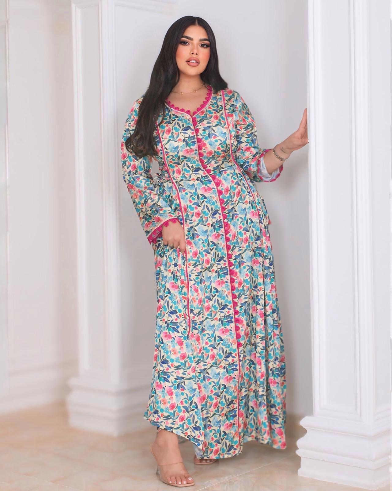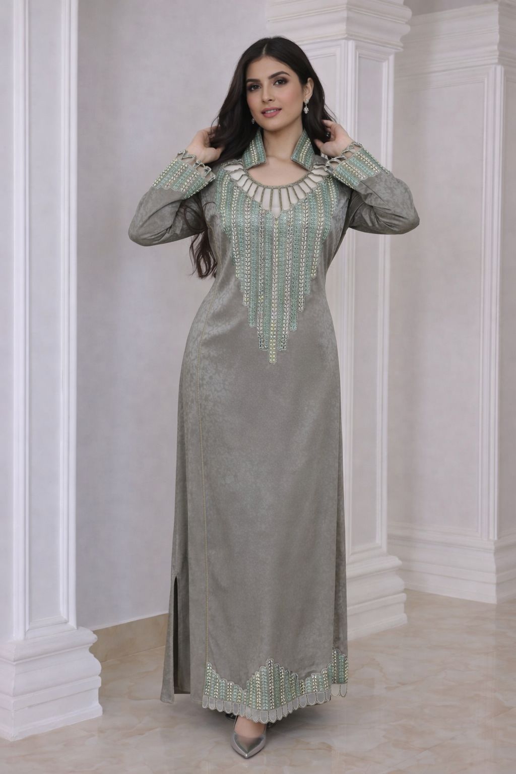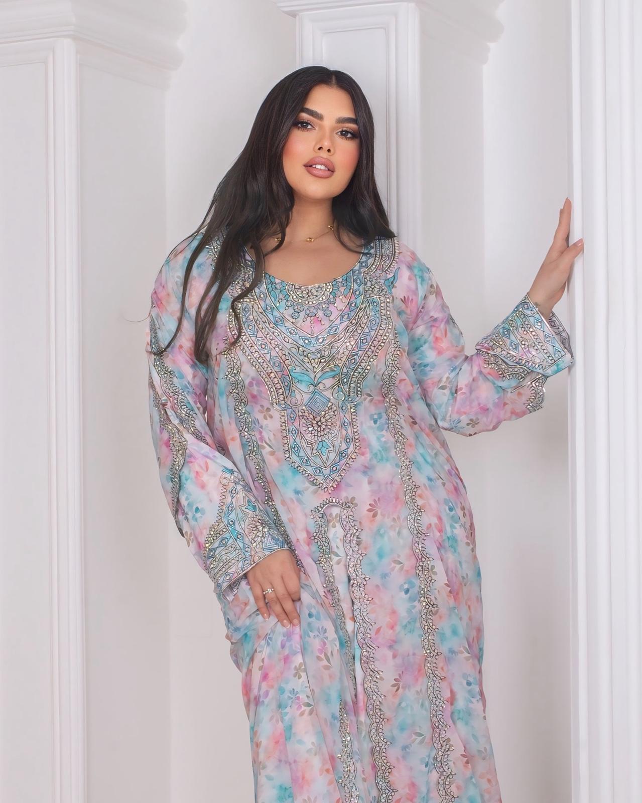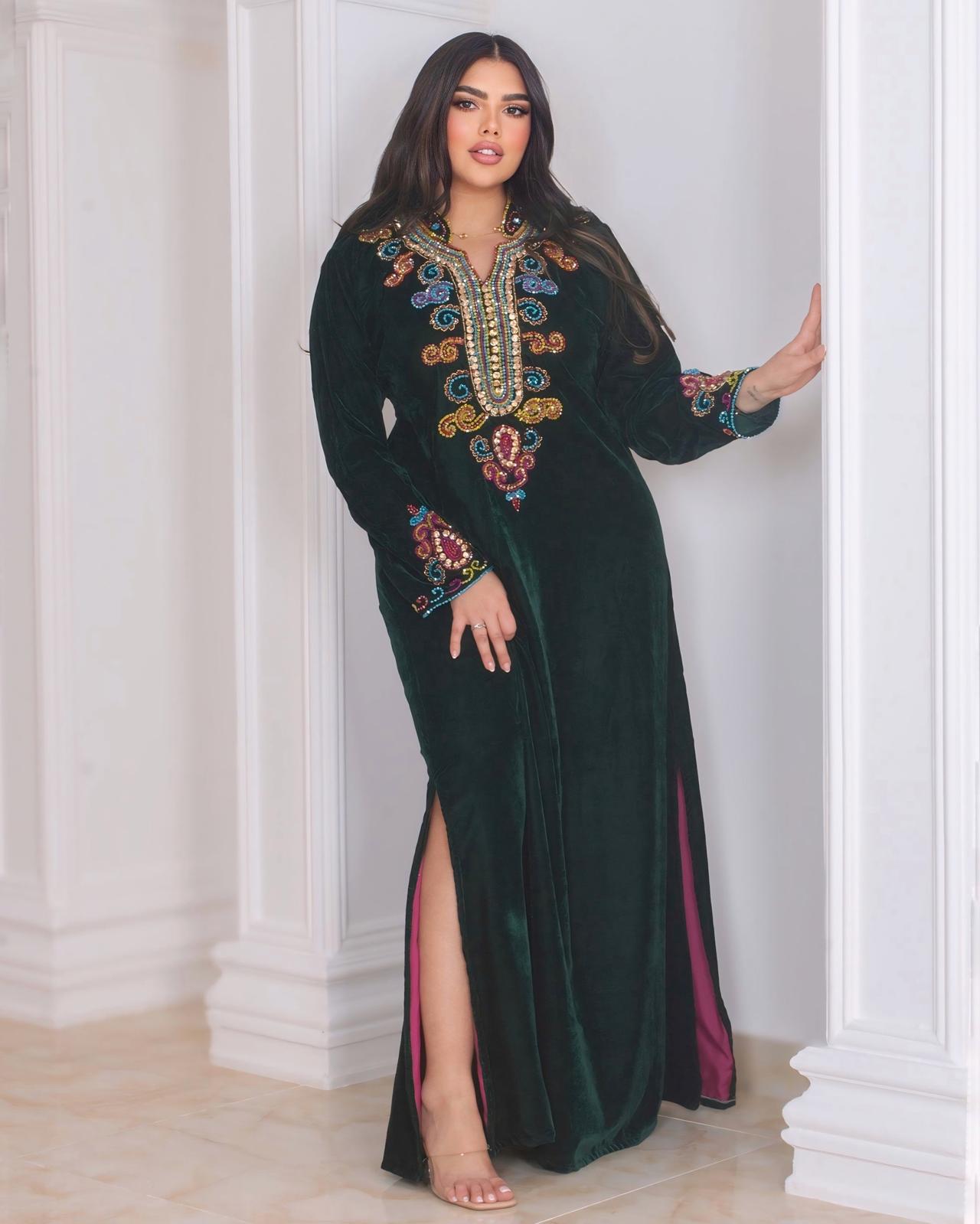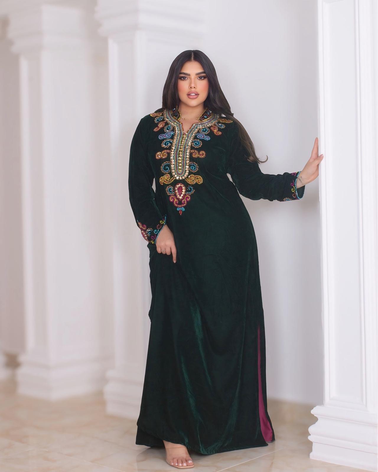A luxurious emerald velvet kaftan adorned with rich multicolor embroidery along the neckline, chest, and sleeves. Designed with a soft, flowy silhouette, this piece offers both elegance and comfort—ideal for Ramadan gatherings, evening events, and festive occasions.