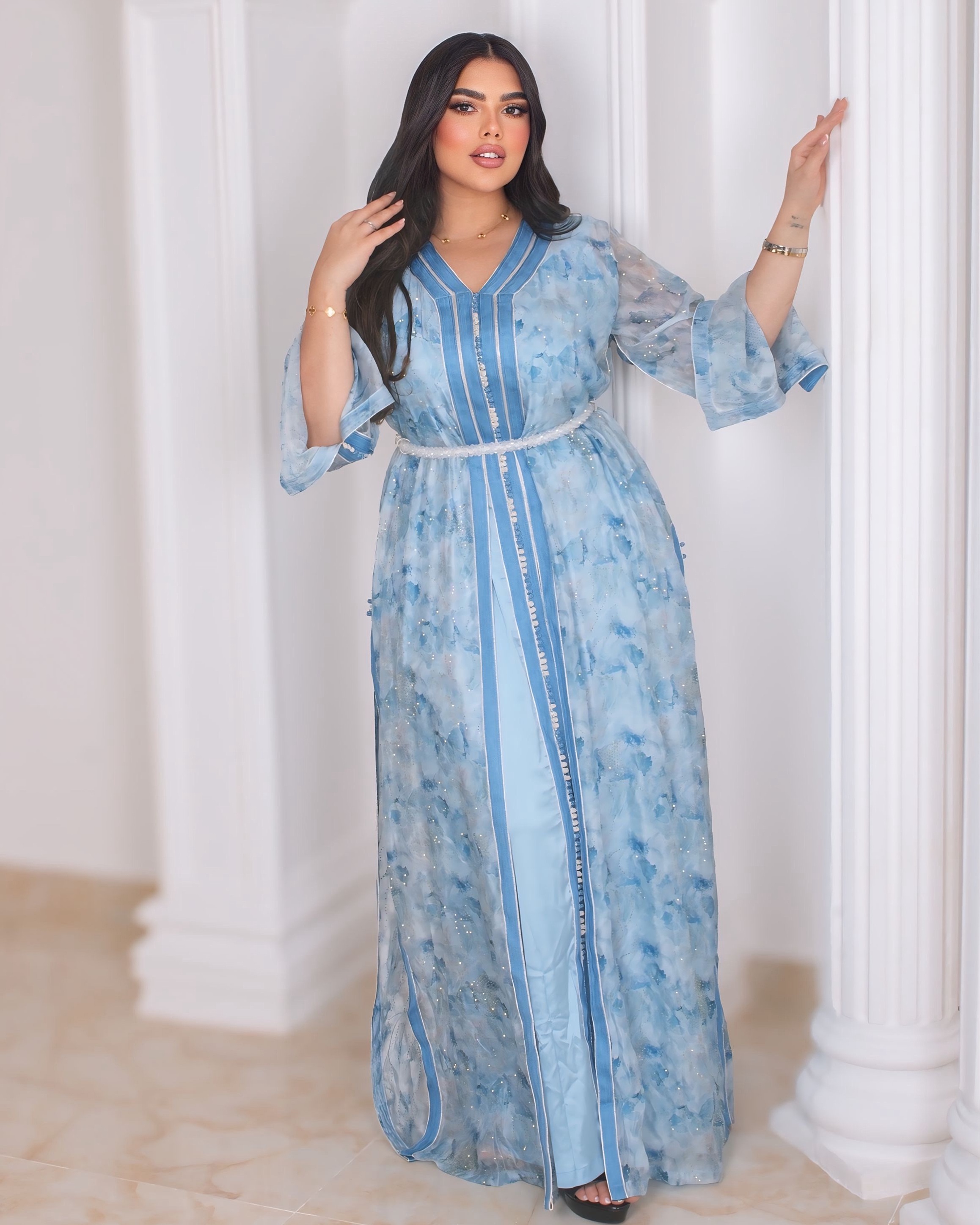 A dreamy sky-blue Mukhawar featuring a sheer printed outer layer and a smooth satin inner lining. Designed with a flattering V-neckline, contrast blue piping, and a slim braided belt for an elegant silhouette—perfect for Ramadan evenings, Eid gatherings, and special occasions.