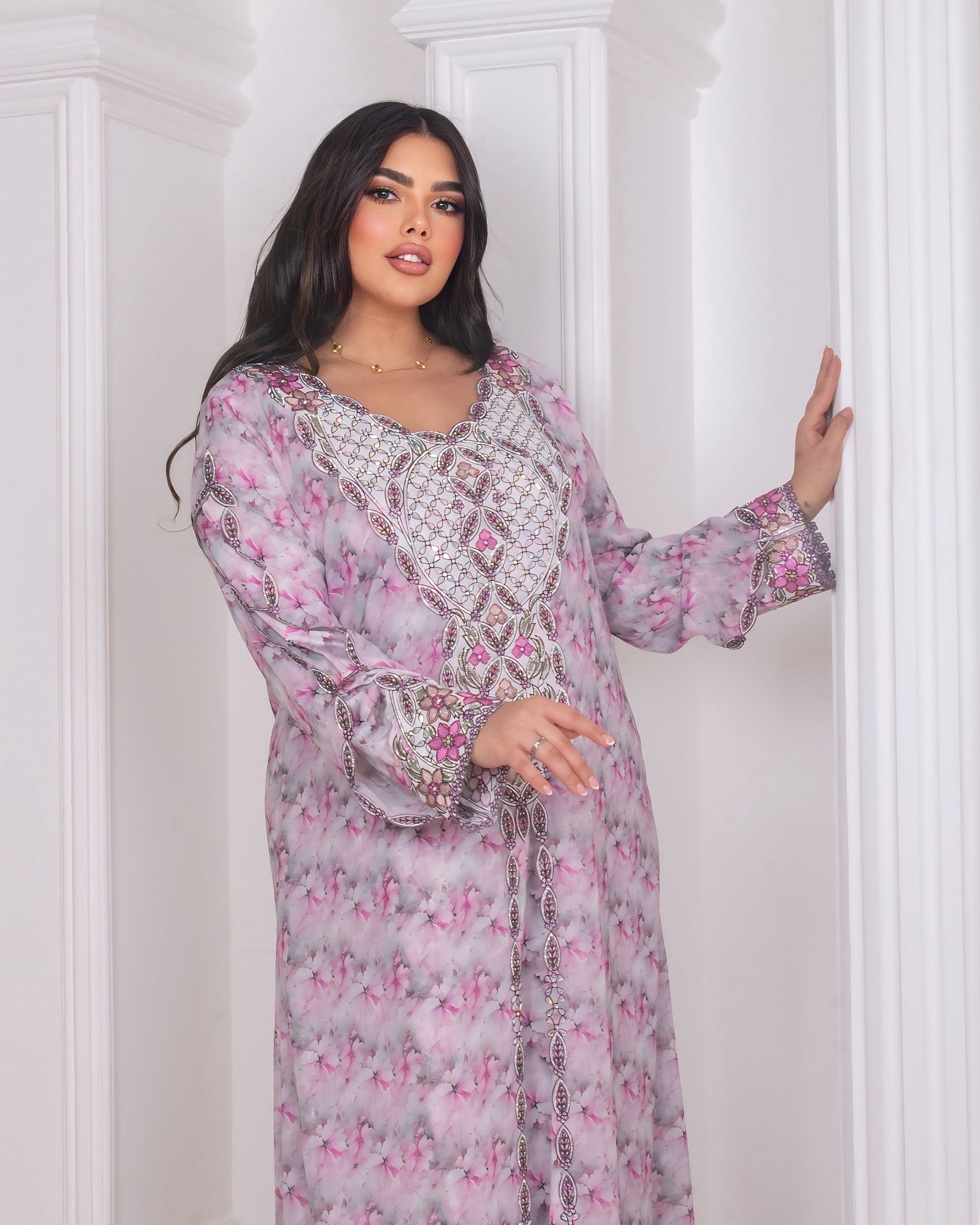 • Color: Pastel grey base with pink floral tones and white/silver embroidery