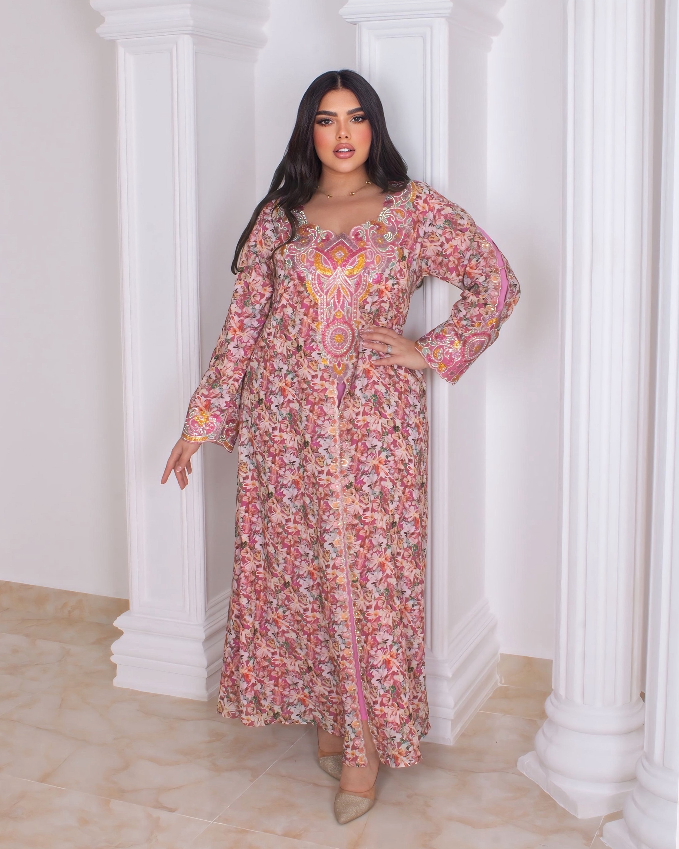 The flowing silhouette paired with the vibrant floral print creates a stunning presence, perfect for festive evenings and Ramadan gatherings. The inner pink panel adds a beautiful contrast, enhancing the overall charm of the outfit. Lightweight, breathable fabric ensures all-day comfort without compromising elegance.